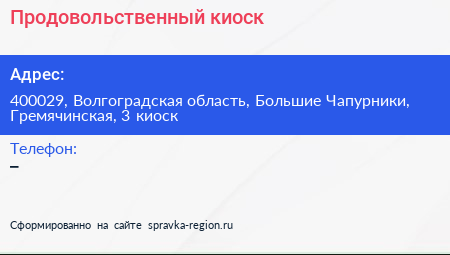 Продовольственный киоск по адресу 400029, Волгоградская область, Большие Чапурники, Гремячинская, 3 киоск в дальнейшем Организация, размещена в следующих категориях: