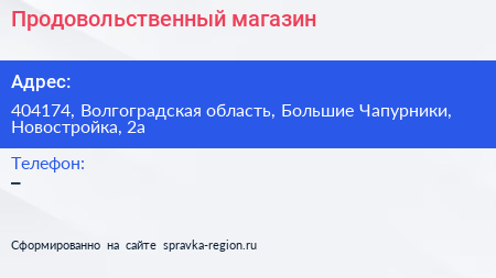 Продовольственный магазин по адресу 404174, Волгоградская область, Большие Чапурники, Новостройка, 2а в дальнейшем Организация, размещена в следующих категориях: