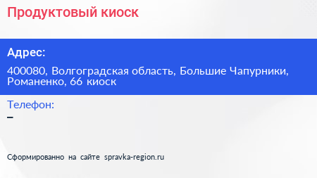 Продуктовый киоск по адресу 400080, Волгоградская область, Большие Чапурники, Романенко, 66 киоск в дальнейшем Организация, размещена в следующих категориях:
