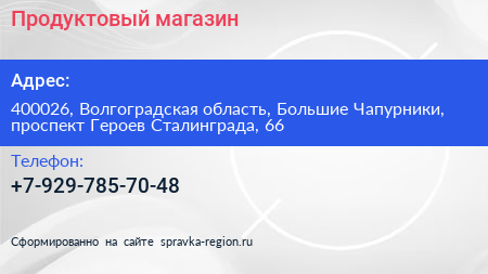 Продуктовый магазин по адресу 400026, Волгоградская область, Большие Чапурники, проспект Героев Сталинграда, 66 в дальнейшем Организация, размещена в следующих категориях: