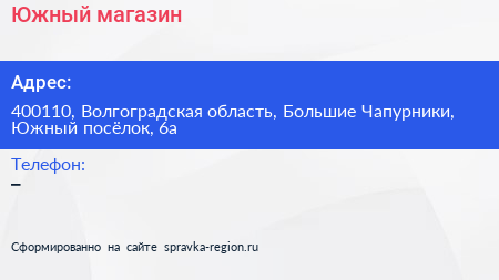 Южный, магазин по адресу 400110, Волгоградская область, Большие Чапурники, Южный посёлок, 6а в дальнейшем Организация, размещена в следующих категориях: