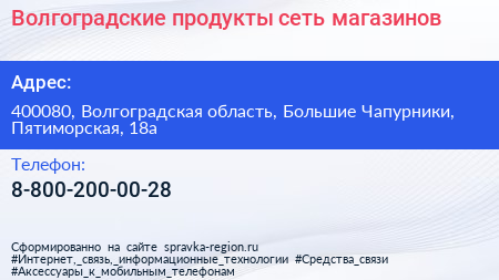 Волгоградские продукты, сеть магазинов по адресу 400080, Волгоградская область, Большие Чапурники, Пятиморская, 18а в дальнейшем Организация, размещена в следующих категориях: