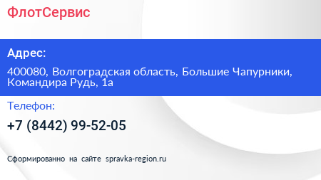 ФлотСервис по адресу 400080, Волгоградская область, Большие Чапурники, Командира Рудь, 1а в дальнейшем Организация, размещена в следующих категориях: