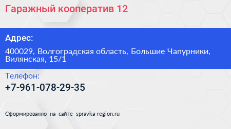 Гаражный кооператив №12 по адресу 400029, Волгоградская область, Большие Чапурники, Вилянская, 15/1 в дальнейшем Организация, размещена в следующих категориях: