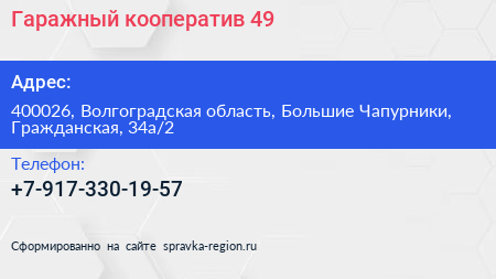 Гаражный кооператив №49 по адресу 400026, Волгоградская область, Большие Чапурники, Гражданская, 34а/2 в дальнейшем Организация, размещена в следующих категориях: