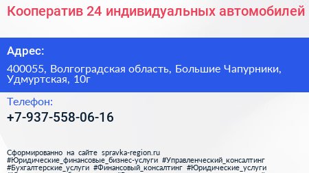 Кооператив №24 индивидуальных автомобилей по адресу 400055, Волгоградская область, Большие Чапурники, Удмуртская, 10г в дальнейшем Организация, размещена в следующих категориях:
