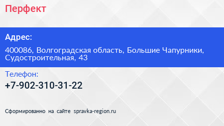 Перфект по адресу 400086, Волгоградская область, Большие Чапурники, Судостроительная, 43 в дальнейшем Организация, размещена в следующих категориях: