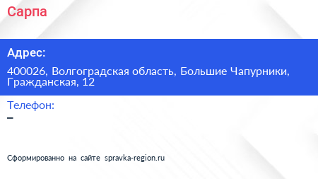 Сарпа по адресу 400026, Волгоградская область, Большие Чапурники, Гражданская, 12 в дальнейшем Организация, размещена в следующих категориях: