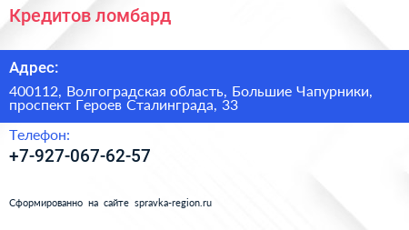 Кредитов, ломбард по адресу 400112, Волгоградская область, Большие Чапурники, проспект Героев Сталинграда, 33 в дальнейшем Организация, размещена в следующих категориях: