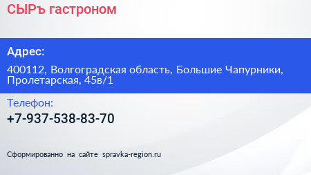 СЫРъ, гастроном по адресу 400112, Волгоградская область, Большие Чапурники, Пролетарская, 45в/1 в дальнейшем Организация, размещена в следующих категориях: