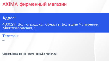 AXIMA, фирменный магазин по адресу 400029, Волгоградская область, Большие Чапурники, Мачтозаводская, 1 в дальнейшем Организация, размещена в следующих категориях: