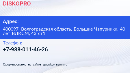 DISKOPRO по адресу 400097, Волгоградская область, Большие Чапурники, 40 лет ВЛКСМ, 43 ст1 в дальнейшем Организация, размещена в следующих категориях: