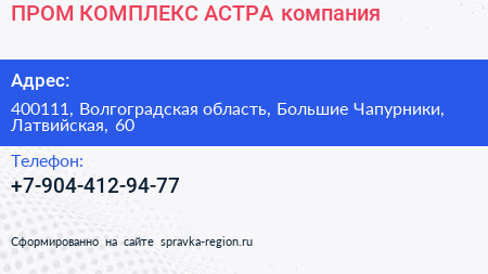 ПРОМ-КОМПЛЕКС АСТРА, компания по адресу 400111, Волгоградская область, Большие Чапурники, Латвийская, 60 в дальнейшем Организация, размещена в следующих категориях: