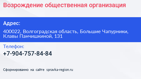 Возрождение, общественная организация по адресу 400022, Волгоградская область, Большие Чапурники, Клавы Панчишкиной, 131 в дальнейшем Организация, размещена в следующих категориях: