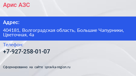 Арис, АЗС по адресу 404181, Волгоградская область, Большие Чапурники, Цветочная, 4а в дальнейшем Организация, размещена в следующих категориях: