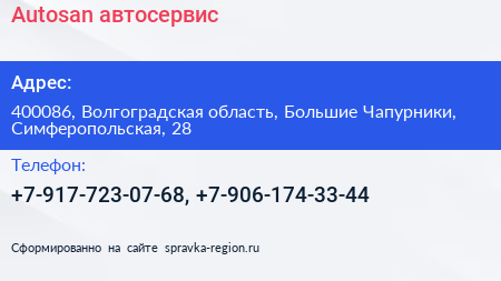 Autosan, автосервис по адресу 400086, Волгоградская область, Большие Чапурники, Симферопольская, 28 в дальнейшем Организация, размещена в следующих категориях:
