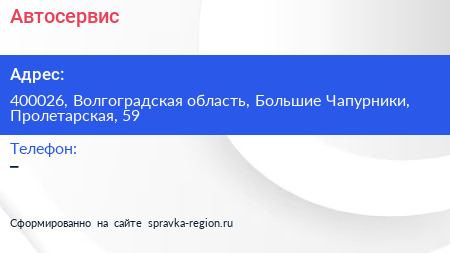 Автосервис по адресу 400026, Волгоградская область, Большие Чапурники, Пролетарская, 59 в дальнейшем Организация, размещена в следующих категориях: