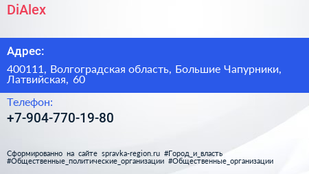 DiAlex по адресу 400111, Волгоградская область, Большие Чапурники, Латвийская, 60 в дальнейшем Организация, размещена в следующих категориях: