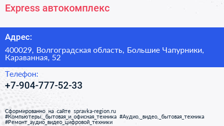 Express, автокомплекс по адресу 400029, Волгоградская область, Большие Чапурники, Караванная, 52 в дальнейшем Организация, размещена в следующих категориях: