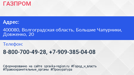 ГАЗПРОМ по адресу 400080, Волгоградская область, Большие Чапурники, Довженко, 20 в дальнейшем Организация, размещена в следующих категориях: