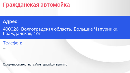 Гражданская, автомойка по адресу 400026, Волгоградская область, Большие Чапурники, Гражданская, 16г в дальнейшем Организация, размещена в следующих категориях: