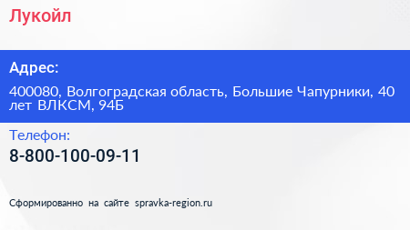 Лукойл по адресу 400080, Волгоградская область, Большие Чапурники, 40 лет ВЛКСМ, 94Б в дальнейшем Организация, размещена в следующих категориях: