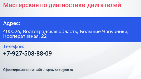 Мастерская по диагностике двигателей по адресу 400026, Волгоградская область, Большие Чапурники, Кооперативная, 22 в дальнейшем Организация, размещена в следующих категориях: