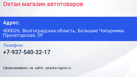 Октан, магазин автотоваров по адресу 400026, Волгоградская область, Большие Чапурники, Пролетарская, 59 в дальнейшем Организация, размещена в следующих категориях: