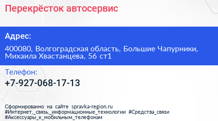 Перекрëсток, автосервис по адресу 400080, Волгоградская область, Большие Чапурники, Михаила Хвастанцева, 56 ст1 в дальнейшем Организация, размещена в следующих категориях: