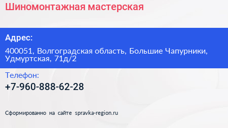 Шиномонтажная мастерская по адресу 400051, Волгоградская область, Большие Чапурники, Удмуртская, 71д/2 в дальнейшем Организация, размещена в следующих категориях: