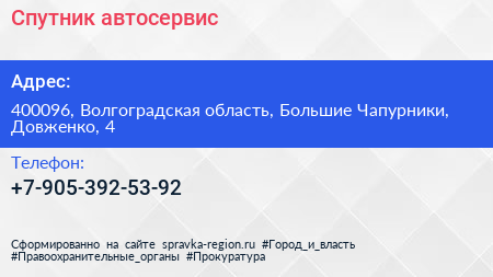 Спутник, автосервис по адресу 400096, Волгоградская область, Большие Чапурники, Довженко, 4 в дальнейшем Организация, размещена в следующих категориях: