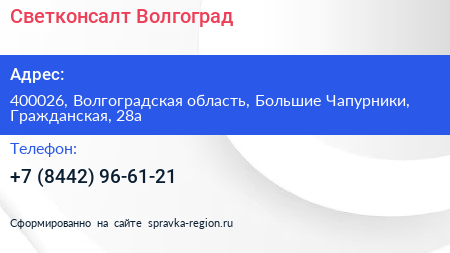 Светконсалт-Волгоград по адресу 400026, Волгоградская область, Большие Чапурники, Гражданская, 28а в дальнейшем Организация, размещена в следующих категориях: