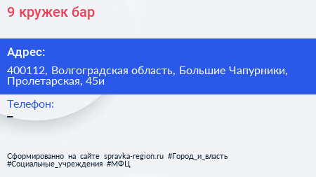 9 кружек, бар по адресу 400112, Волгоградская область, Большие Чапурники, Пролетарская, 45и в дальнейшем Организация, размещена в следующих категориях: