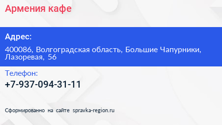 Армения, кафе по адресу 400086, Волгоградская область, Большие Чапурники, Лазоревая, 56 в дальнейшем Организация, размещена в следующих категориях: