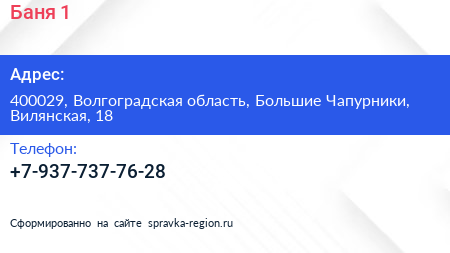 Баня №1 по адресу 400029, Волгоградская область, Большие Чапурники, Вилянская, 18 в дальнейшем Организация, размещена в следующих категориях: