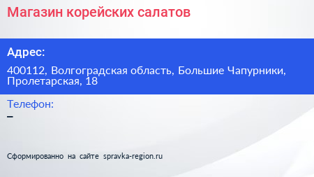 Магазин корейских салатов по адресу 400112, Волгоградская область, Большие Чапурники, Пролетарская, 18 в дальнейшем Организация, размещена в следующих категориях: