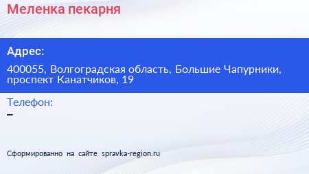 Меленка, пекарня по адресу 400055, Волгоградская область, Большие Чапурники, проспект Канатчиков, 19 в дальнейшем Организация, размещена в следующих категориях: