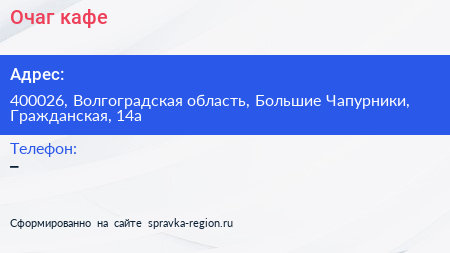 Очаг, кафе по адресу 400026, Волгоградская область, Большие Чапурники, Гражданская, 14а в дальнейшем Организация, размещена в следующих категориях: