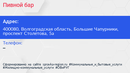 Пивной бар по адресу 400080, Волгоградская область, Большие Чапурники, проспект Столетова, 5а в дальнейшем Организация, размещена в следующих категориях: