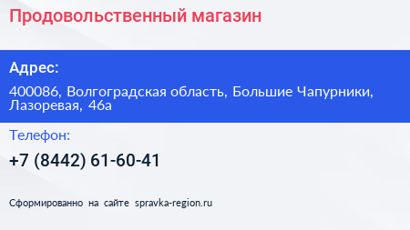 Продовольственный магазин по адресу 400086, Волгоградская область, Большие Чапурники, Лазоревая, 46а в дальнейшем Организация, размещена в следующих категориях:
