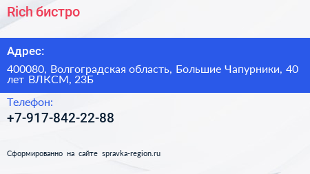Rich, бистро по адресу 400080, Волгоградская область, Большие Чапурники, 40 лет ВЛКСМ, 23Б в дальнейшем Организация, размещена в следующих категориях: