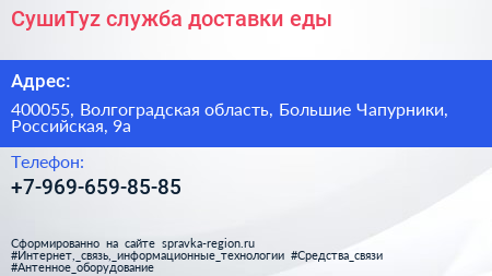 СушиTyz, служба доставки еды по адресу 400055, Волгоградская область, Большие Чапурники, Российская, 9а в дальнейшем Организация, размещена в следующих категориях: