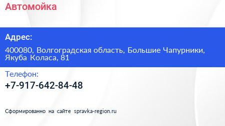 Автомойка по адресу 400080, Волгоградская область, Большие Чапурники, Якуба Коласа, 81 в дальнейшем Организация, размещена в следующих категориях: