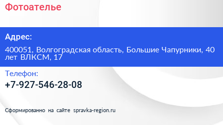 Фотоателье по адресу 400051, Волгоградская область, Большие Чапурники, 40 лет ВЛКСМ, 17 в дальнейшем Организация, размещена в следующих категориях: