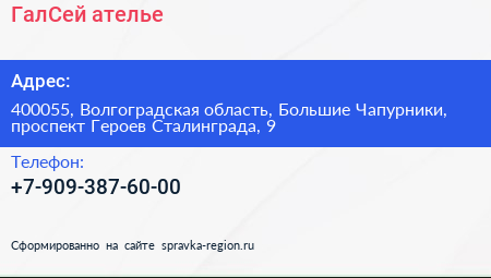 ГалCей, ателье по адресу 400055, Волгоградская область, Большие Чапурники, проспект Героев Сталинграда, 9 в дальнейшем Организация, размещена в следующих категориях: