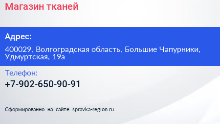 Магазин тканей по адресу 400029, Волгоградская область, Большие Чапурники, Удмуртская, 19а в дальнейшем Организация, размещена в следующих категориях: