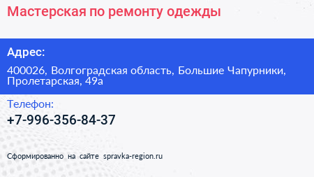 Мастерская по ремонту одежды по адресу 400026, Волгоградская область, Большие Чапурники, Пролетарская, 49а в дальнейшем Организация, размещена в следующих категориях: