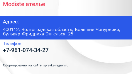 Modiste, ателье по адресу 400112, Волгоградская область, Большие Чапурники, бульвар Фридриха Энгельса, 25 в дальнейшем Организация, размещена в следующих категориях: