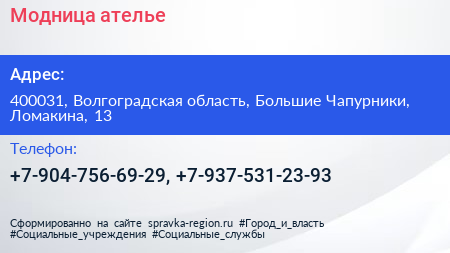 Модница, ателье по адресу 400031, Волгоградская область, Большие Чапурники, Ломакина, 13 в дальнейшем Организация, размещена в следующих категориях: