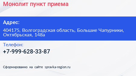 Монолит, пункт приема по адресу 404175, Волгоградская область, Большие Чапурники, Октябрьская, 148а в дальнейшем Организация, размещена в следующих категориях: